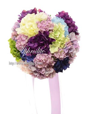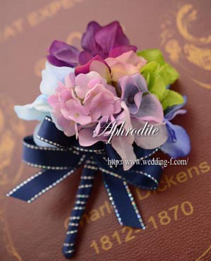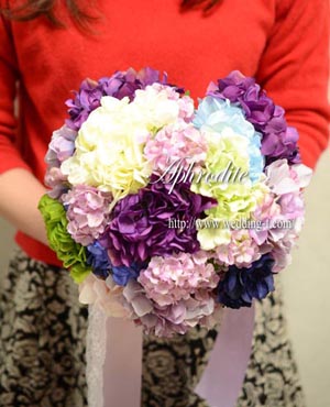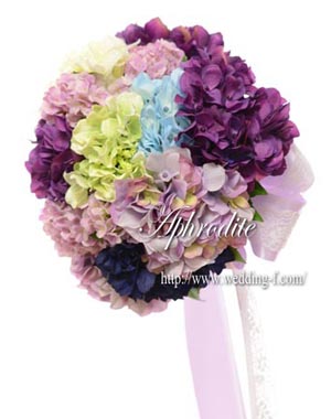 紫をベースに、「水色・グリーン・ピンク・ネイビー」 を合わせた ハートシェイプブーケ。