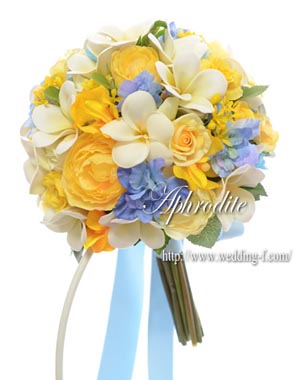プルめりあをメインに、イエローと水色を足したクラッチブーケ。