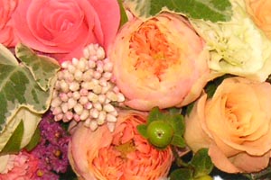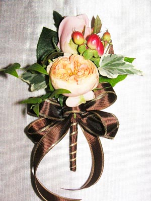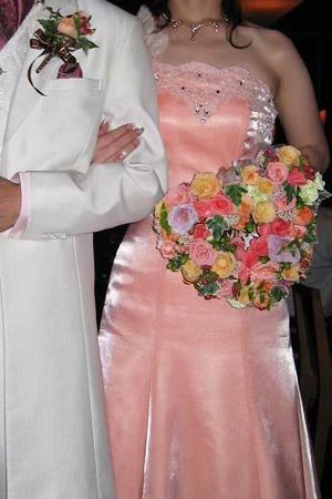 サーモンピンクのドレスに合わせて、沢山のバラや実もので作ったブーケです。