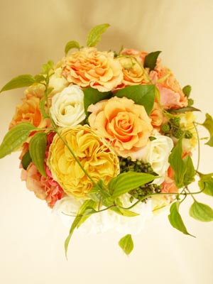 明るいイエロー・オレンジ系に柔らかなグリーンを合わせたブーケ。