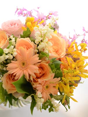 バラ、ガーベラ、オンシジューム、モカラ、スズラン、ピットスポルム、アストランジャー |