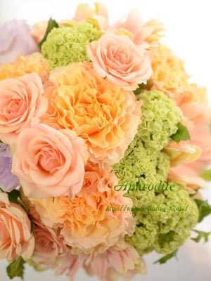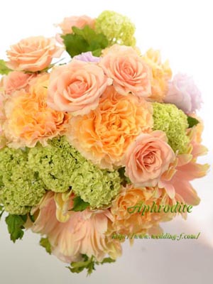 ■爽やかなグリーン、美味しそうなオレンジ、挿し色にパープルを使ったブーケ。