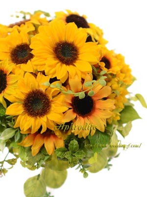 お日様みたいなひまわりを中心にギュとまとめ、形・色が異なるグリーンを裾に。