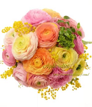 ■優しいパステルカラーのラナンキュラス・フワフワ揺れるミモザが、愛らしいブーケです。