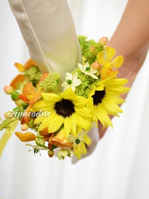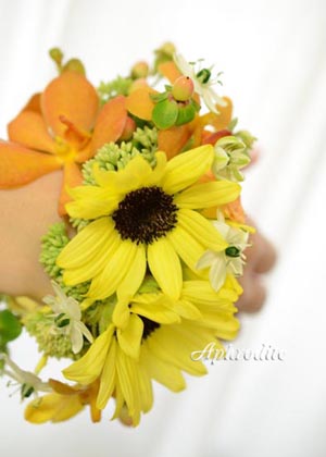 可愛い、ミニタイプのひまわりをポイントに小花を繋ぎました。