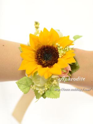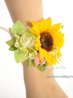 ひまわりの両サイドに白薔薇を1輪づつ、斜めサイドにシャーベットオレンジのミニバラを1輪、周りに実ものとリーフで、可愛く纏めたリストレットです。