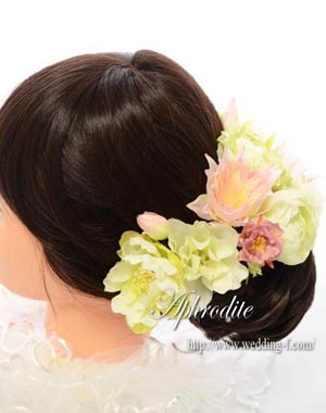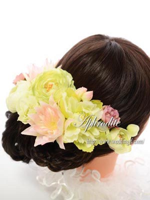 「パステルグリーンのドレス、ウエストにパステルピンクのコサージュ付」 とても綺麗なドレスに合わせて、ヘッドパーツをリクエストされました。