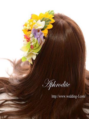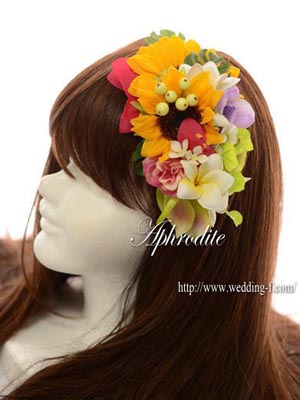 ■ひまわり、プルメリア・ブーゲンビリア・モンステラなど南国ムード溢れる花材でヘッドドレスをお作りしました。
