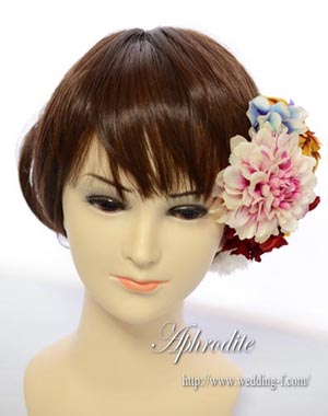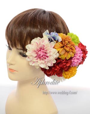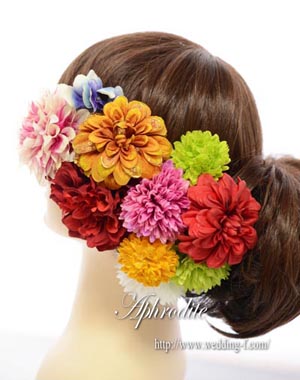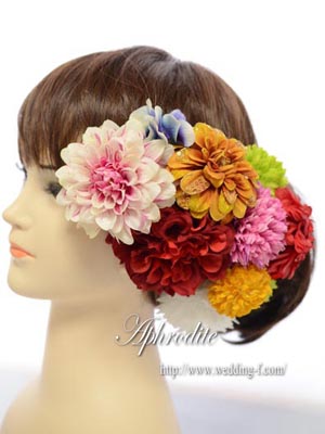 綺麗なグラデーションやビジュー付きのダリア、赤・緑・黄・ピンク・ブルーとカラフルながらも古典的なカラーリングで纏めたヘッドピースです。