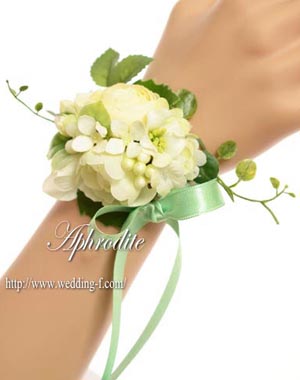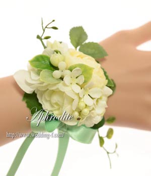 白・オフホワイトのお花をメインに、グリーンを添えた、小ぶりなリストレット。