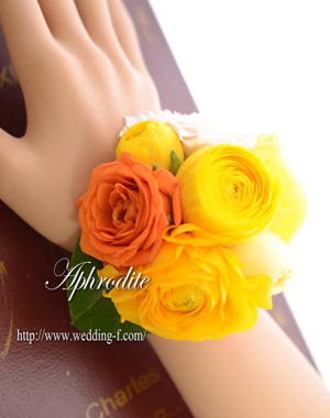 コロコロしたラナンキュラスと、ミニバラを合わせた、キュートなリストレット。