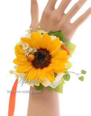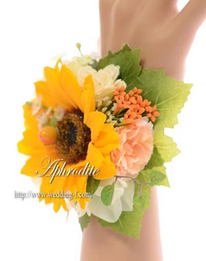 ひまわりをポイントに、グルリとお花・実・リーフなどで取り巻いたデザイン。
