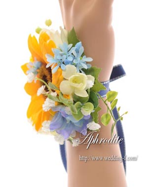 ひまわりをポイントに、グルリとお花・実・リーフなどで取り巻いたデザイン。