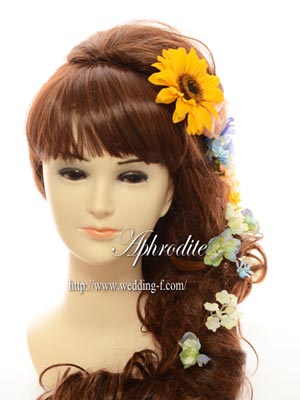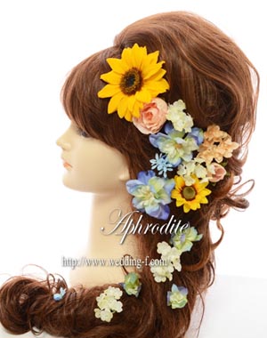 ひまわり、バラ、デルフィニューム、アジサイ、ビバーナム、ミニヒマワリ、スターフラワー |