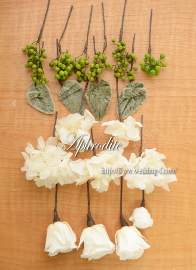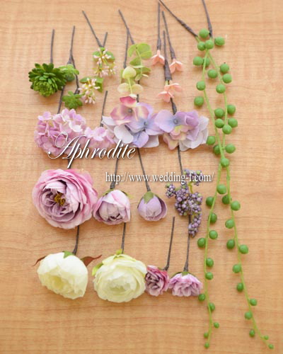シルクフラワー→バラ、アジサイ、ブバリア、ビバーナム、多肉、グラスベリー、グリーンネックレス、ユーカリ