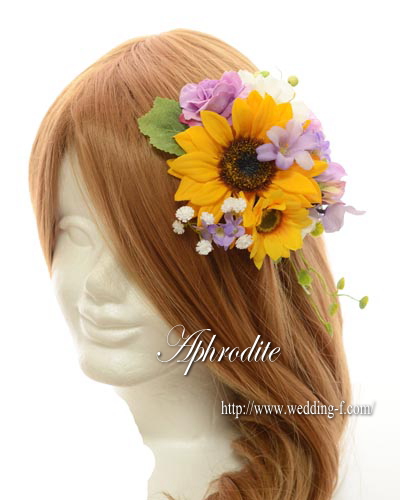 ひまわり大小に、紫と白を合わせたヘッドピース。