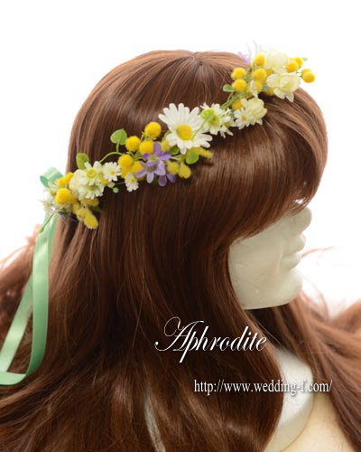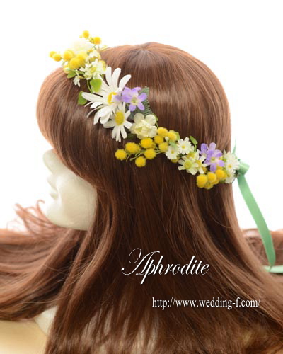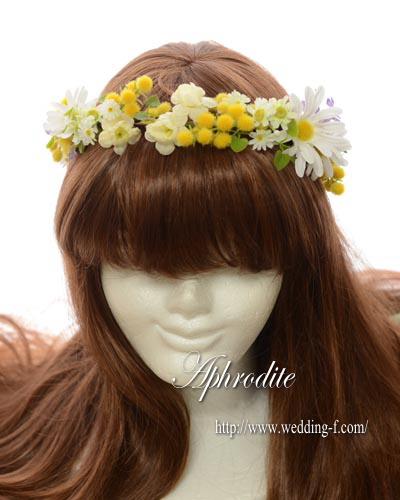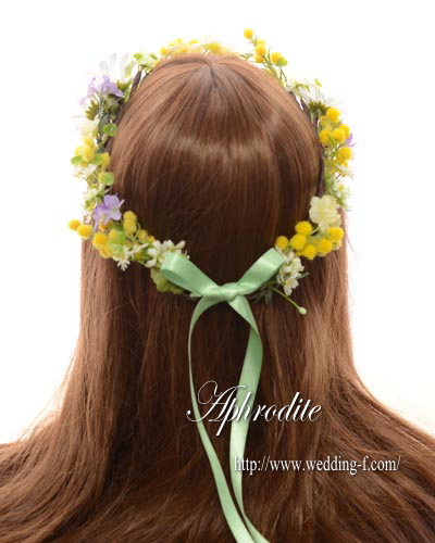 ミモザをポイントに、愛らしい小花を纏めた花冠。