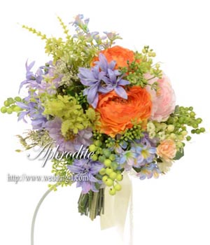 まあるいラナンキュラスやバラに、グリーンと紫を足した「ナチュラル可愛い系」のブーケ。