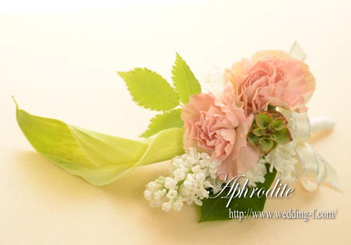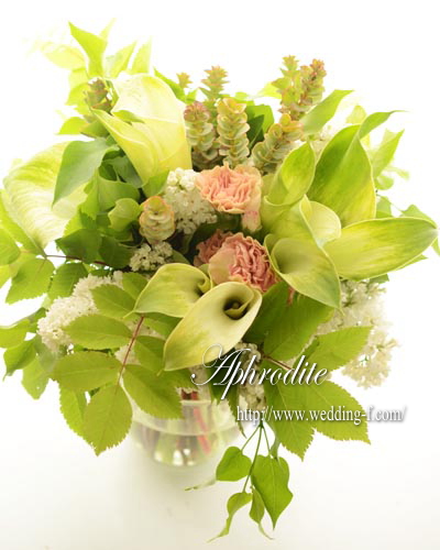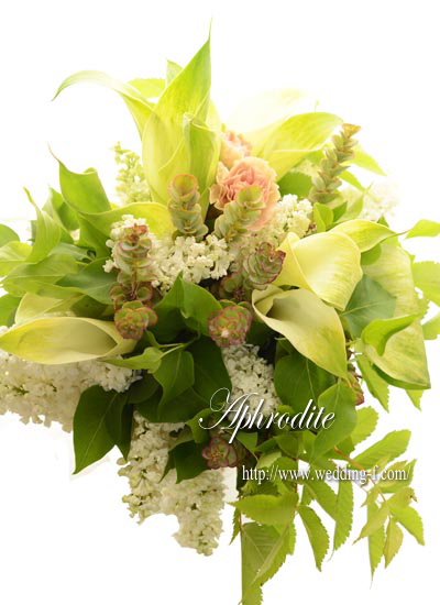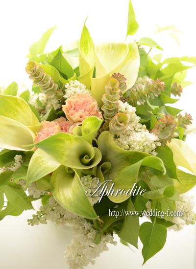 白いライラックとグリーンカラーをメインに、爽やかなグリーンのナナカマドやベージュのカーネーションを添えた、大人のブーケ。