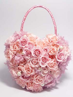 ■と~っても、スィートでキュートなハート型バッグブーケです。バラもアジサイも全てピンクを使用。ピンク大好きなスィートな花嫁様に~