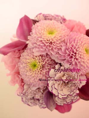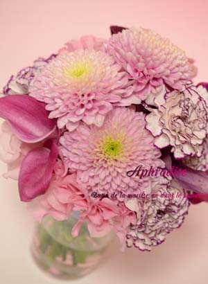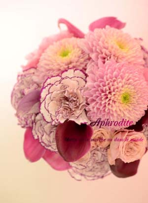 ■可愛いピンクマムとパープル系のカラーやカーネーションを合わせた大人可愛いブーケ。