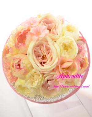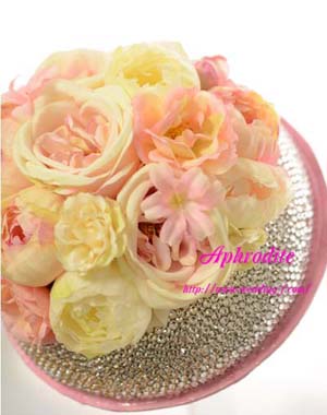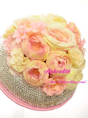 ※スワロフスキーをふんだんに使って、お花を取巻いたリングブーケはアフロディーテのオリジナルブーケです。