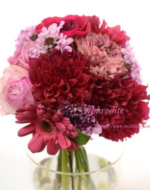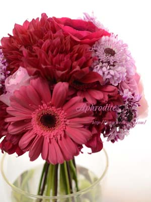 バラ、ダリア、ガーベラ、スカビオサ、レモンリーフ |
