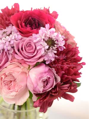 美しい大輪ダリアをポイントに、くすみ系ピンクのバラやひらひらした花びらが優しいスカビオサを合わせました。