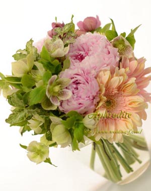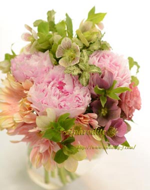 フンワリ咲いたシャクヤクに、大輪ガーベラやクリスマスローズを合わせました。
