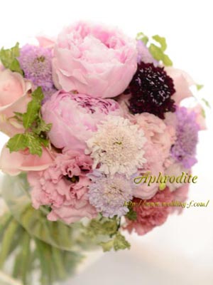 シャクヤク、バラ、トルコキキョウ、スカビオサ、ピットスポルム |