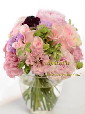 ピンクシャクヤクにピンクローズやトルコキキョウ。ビターなスカビオサが挿し色になっています。