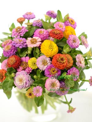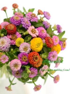 カラフルなのに、古風な雰囲気を持つジニアをざっくりと纏めたブーケです。
