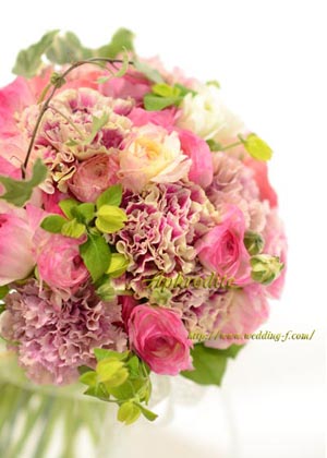 ラナンキュラス、カーネーション、ベロベロネ、アイビー、レモンリーフ |