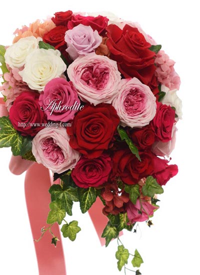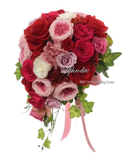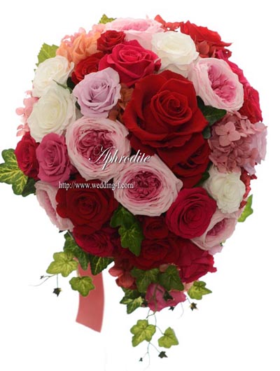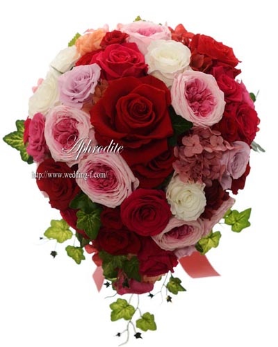 赤をメインに、ピンクや白を合わせたティアドロップブーケ。