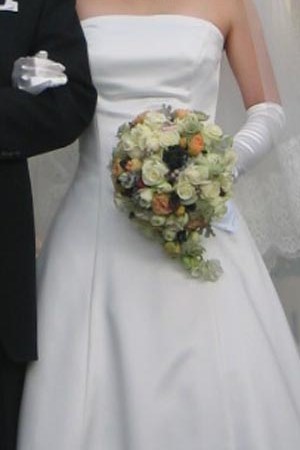 シンプルなドレスに合わせた、ちょっと面白い花合わせのブーケ。