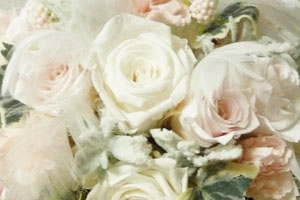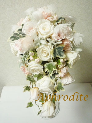 そこで、白薔薇にと~っても淡いシャーベットピンクを合わせて、羽をプラスし、「優しさ・可愛さ・フンワリ感」を出しました。 |