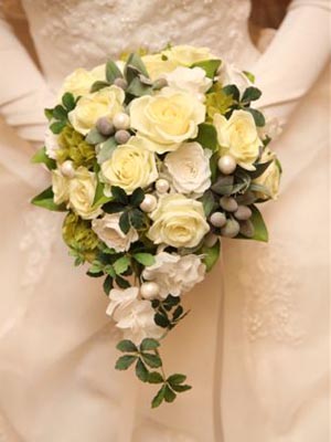 ■ベビーイエローと白バラのプリザーブドに、実ものとグリーンを添えて~。明るくてナチュラルなティアドロップブーケです。