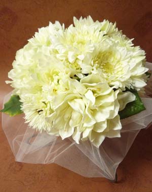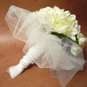 ■オフホワイトのお花を、チュールで包みました。