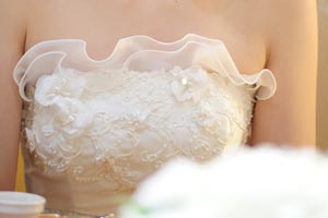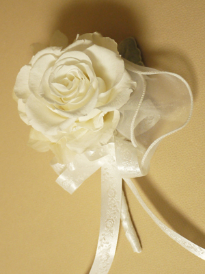 ドレスの胸元とお揃いにしたバラの中のフリルリボンがフェミニン❤