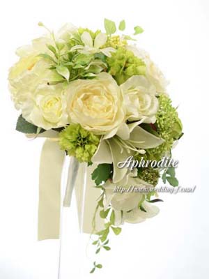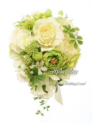 大輪バラが華やかな、白グリーンの綺麗なティアドロップブーケです。