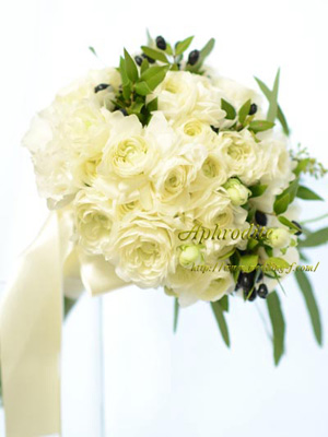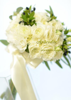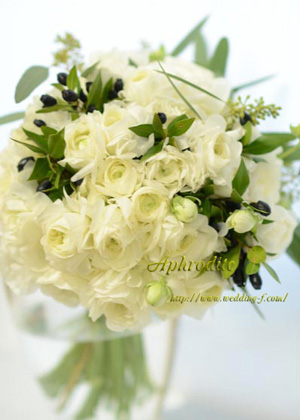 ■ホワイトラナンキュラスに黒実のシャリンバイを合わせた冬のブーケ。