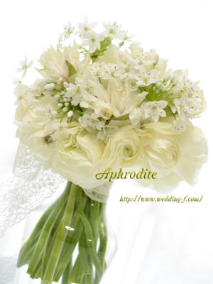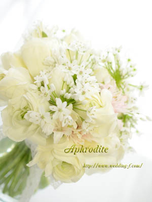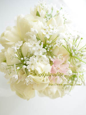 「ラナンキュラス・コアニー・ダイヤモンドリリー」などの白いお花の中に、極淡ピンクをさし色にしました。