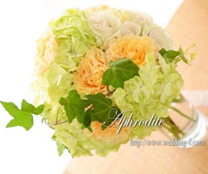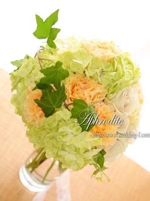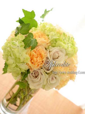 アジサイのグリーン+シャーベットオレンジ+ニュアンスカラーのローズが、美しいハーモニーを奏でます❤