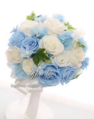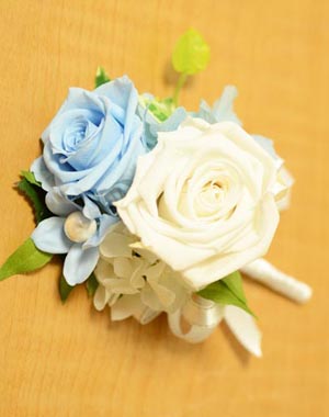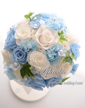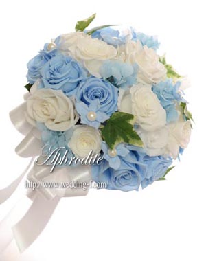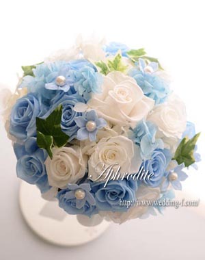 綺麗な白と水色のバラにジャスミン、アジサイを合わせました。