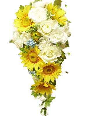■ナチュラル感たっぷりの、ヒマワリと白バラのキャスケードブーケです。