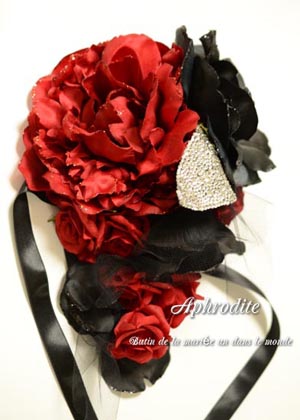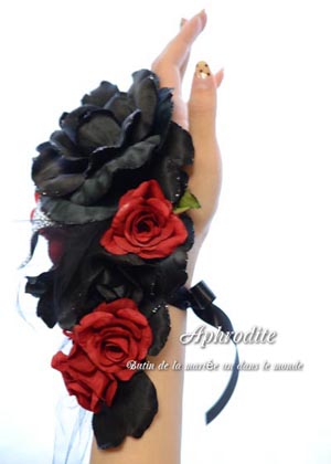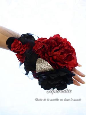 ■大輪の芍薬とバラを使った、縦型タイプのリストブーケ。おはなの間から覗くスワロフスキーが煌めきます。