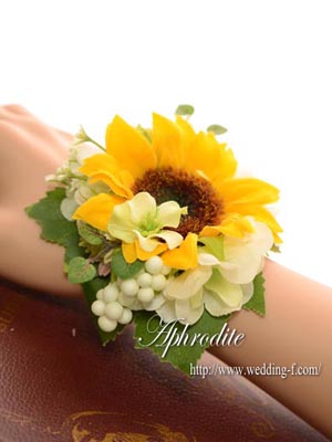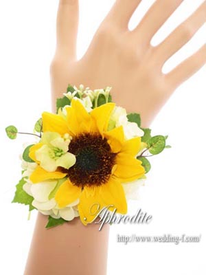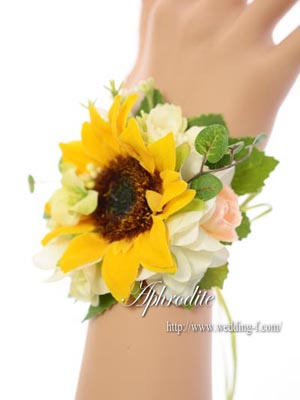 オレンジひまわりをポイントに小花や実もの、グリーンを合わせた、可愛いリストレット。