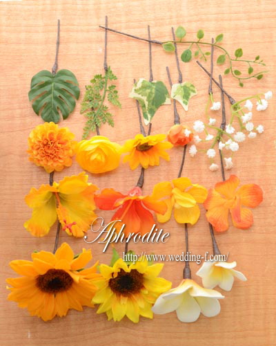 ひまわり、ハイビスカス、モカラ、マリーゴールド、プルメリア、カスミソウ、ラナンキュラス、モンステラ、ファーン、アイビー、ツル