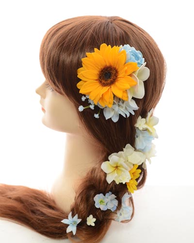 ひまわり、ミニひまわり、プルメリア、アジサイ、バラ、ブロッサムスプレー、カスミソウ、ネリネ、ジャスミン