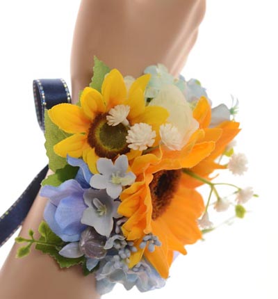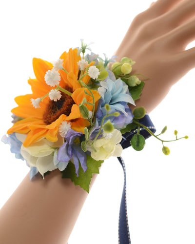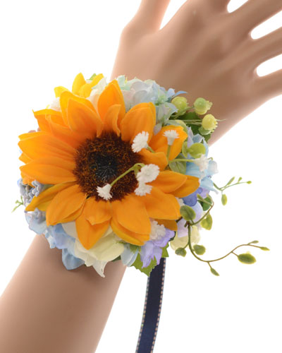ひまわり、あじさい、ベリー、エンジェルリーフ、デルフィニューム、アキレア、カスミソウ、ジャスミン